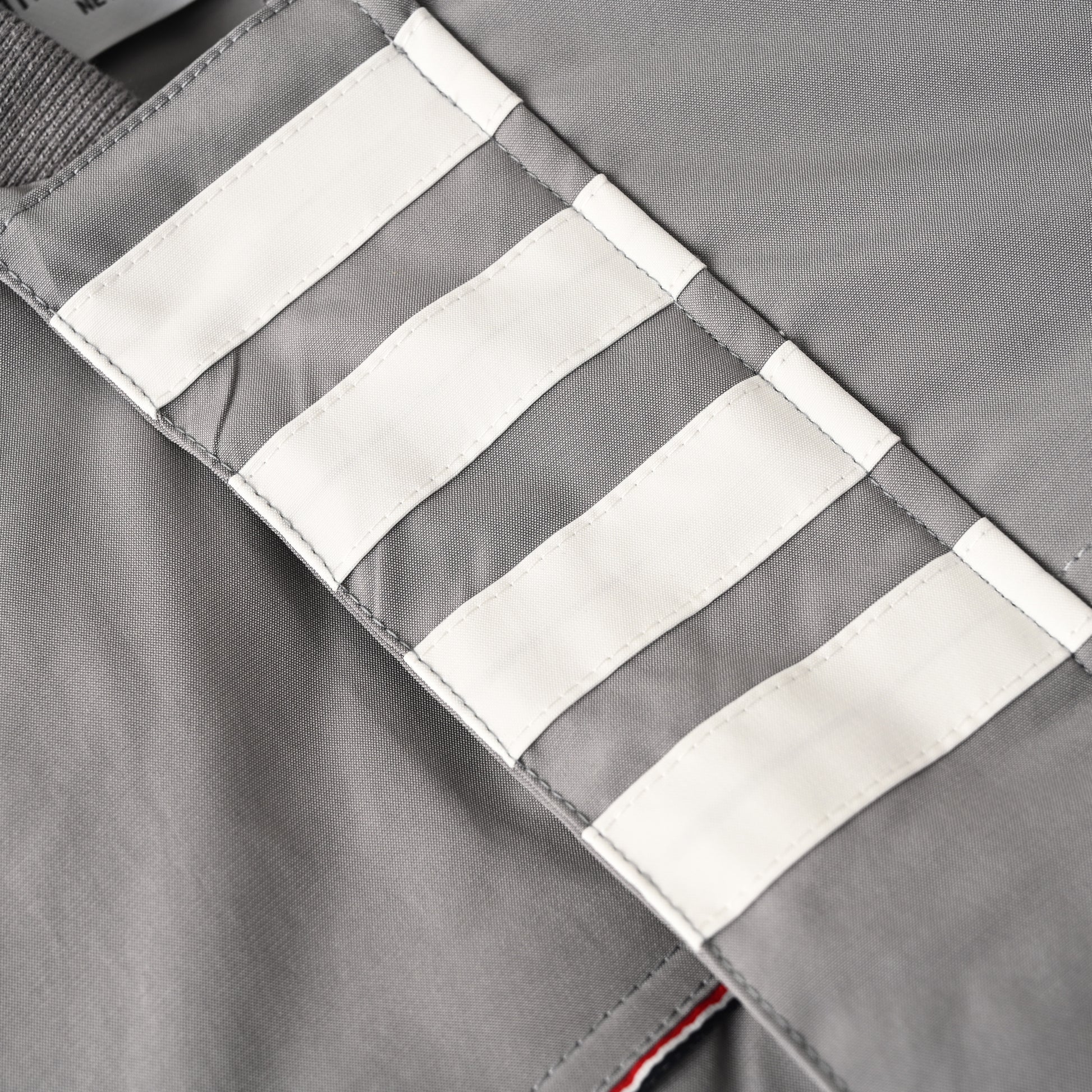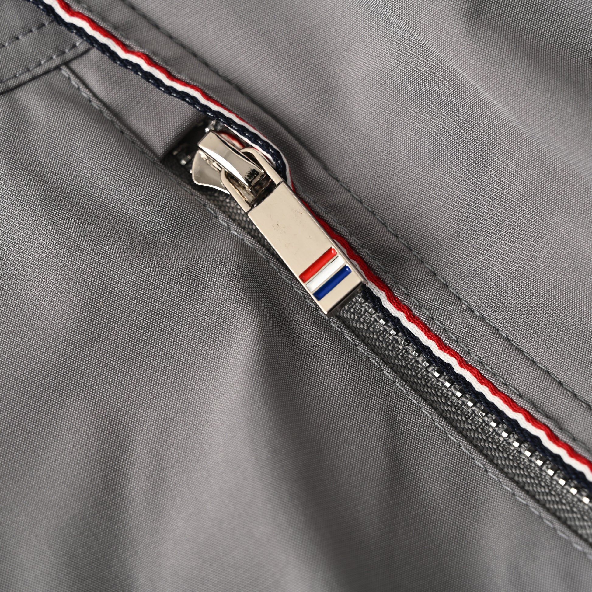 Front zip closure. Signature striped grosgrain buckle at back of neck.